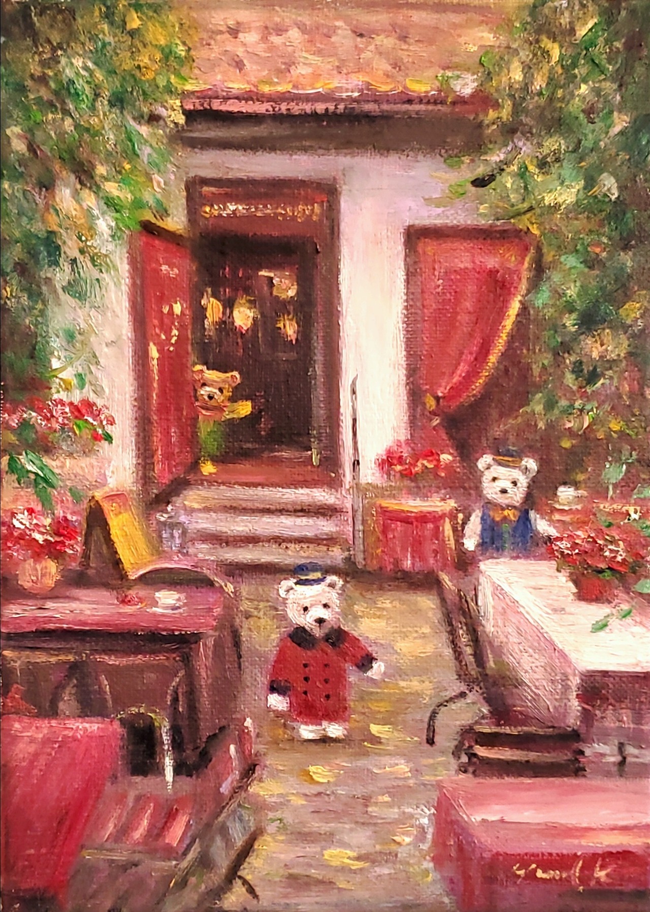 絵画 「クマ達のチョコレートカフェ」 エストニア タリン 風景画 油彩画 Yumi Kohnoura 神之浦由美 作品 原画