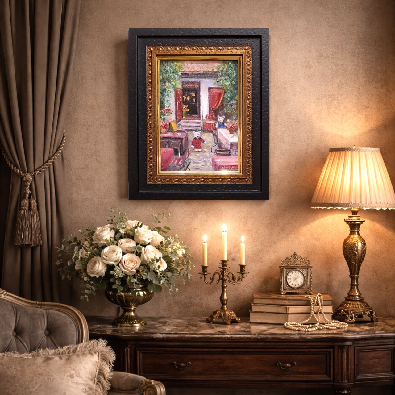 エストニア・タリンの旧市街にあるチョコレートカフェを舞台にクマ達が登場する大人可愛い作品。小さなサイズで飾りやすく、コレクションしやすい絵画です。お部屋のインテリアにもプレゼントにもおすすめです。