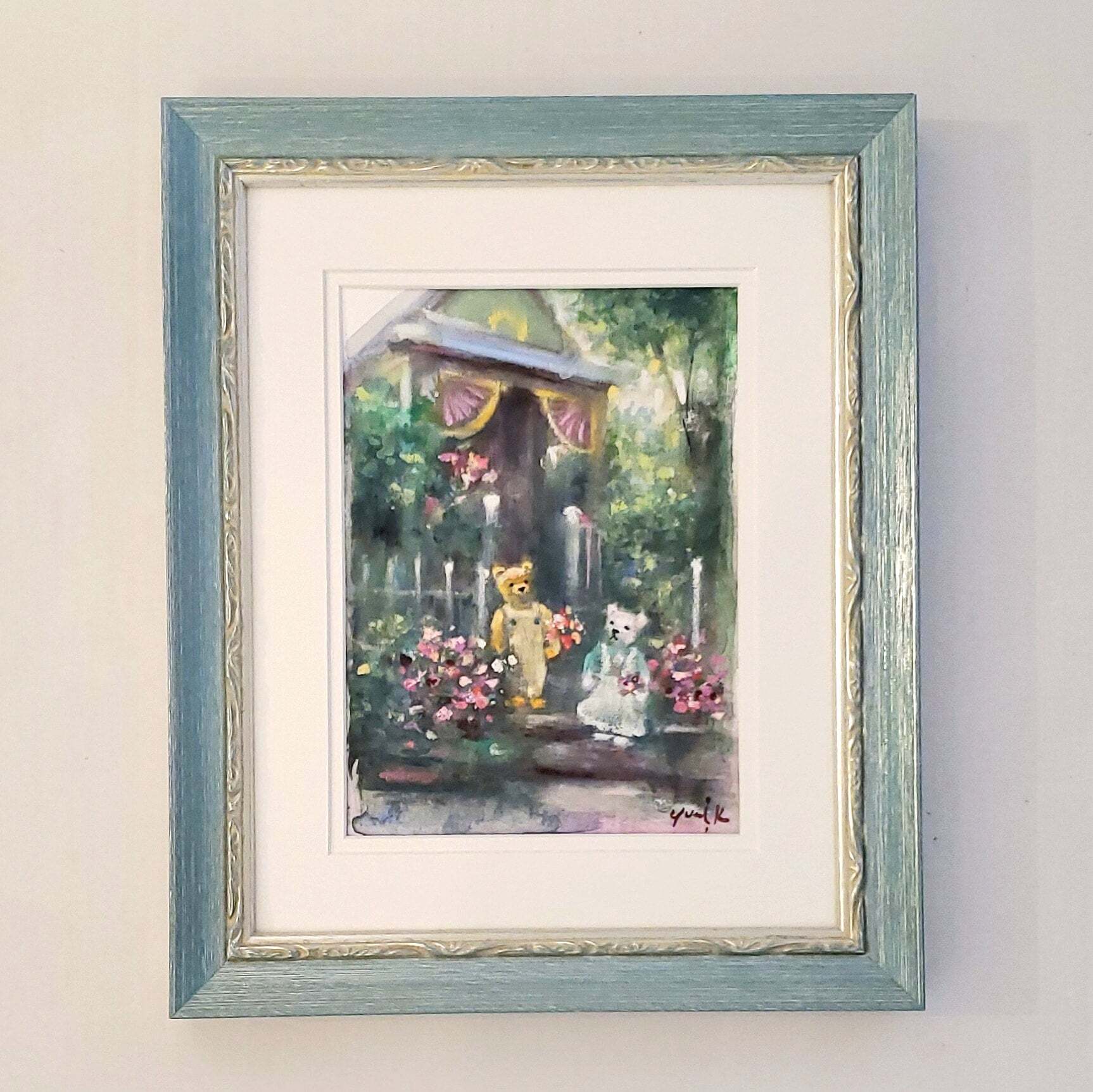 お花を持ったクマたちが大人可愛い絵画です。原画に合わせた高級感あるアンティークブルー×シルバーの木製フレーム付きです。