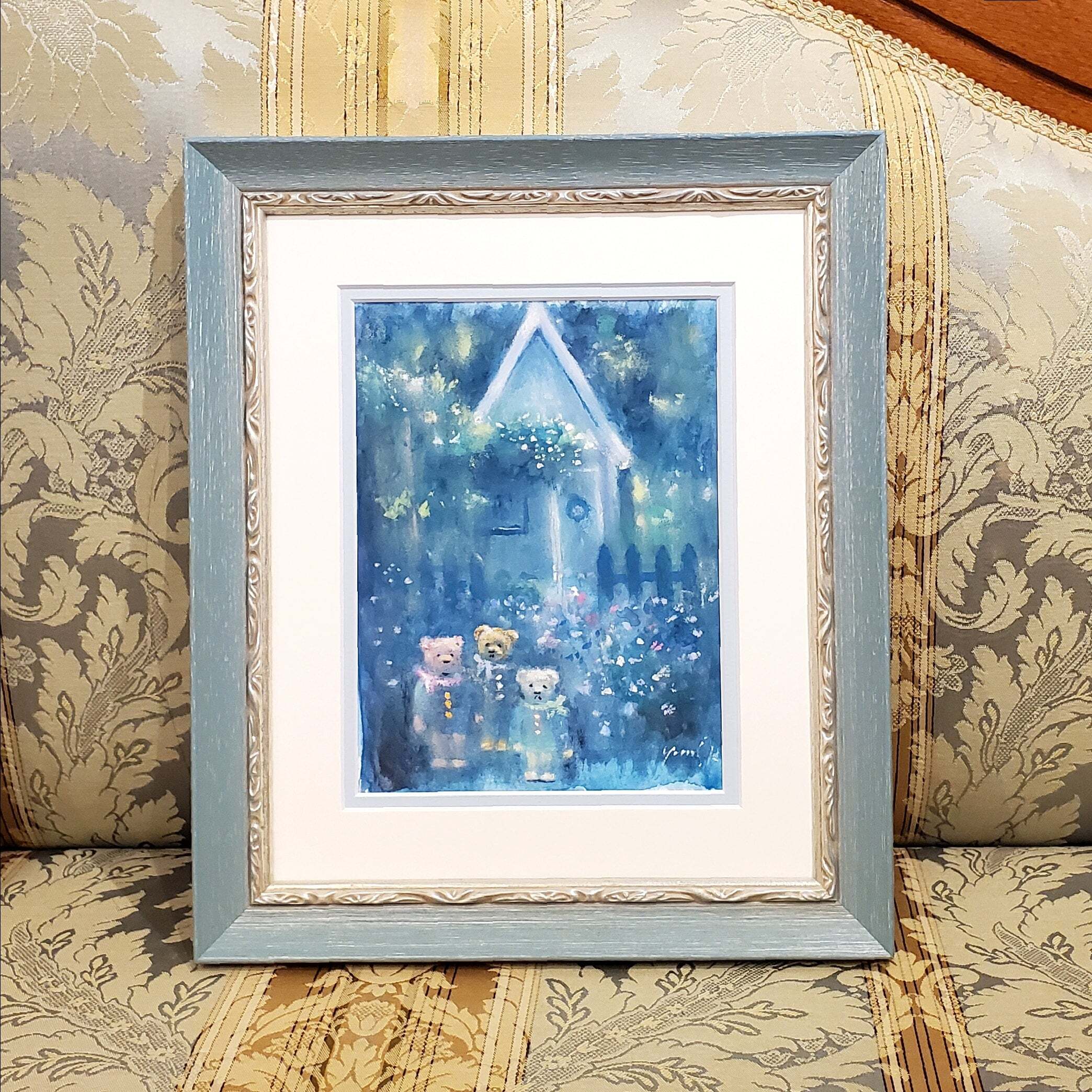 ブルーを基調とした美しい景色の中に、テディベア達の登場するメルヘンな世界観。小さなサイズで飾りやすく、コレクションしやすい絵画です。お部屋のインテリアにもプレゼントにもおすすめです♪