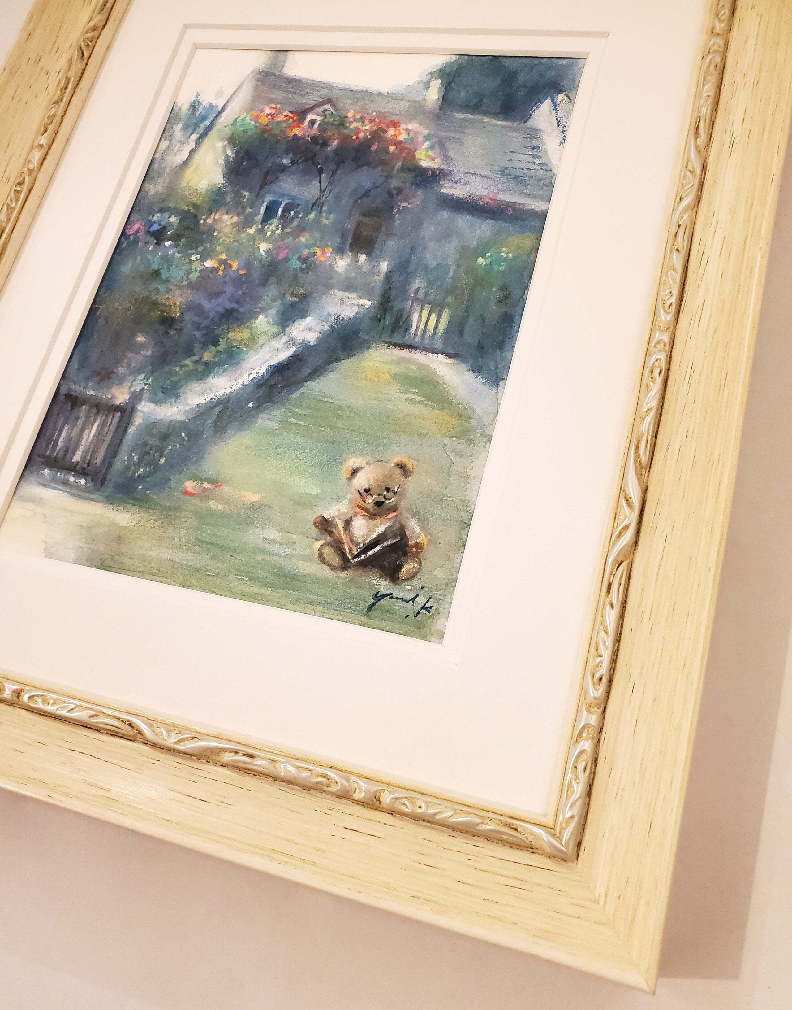 イギリス、コッツウォルズの景色の中で、テディベアが読書をしている姿が描かれています。よく見ると、本ではなくこちらを見ているクマさんが愛らしいです。