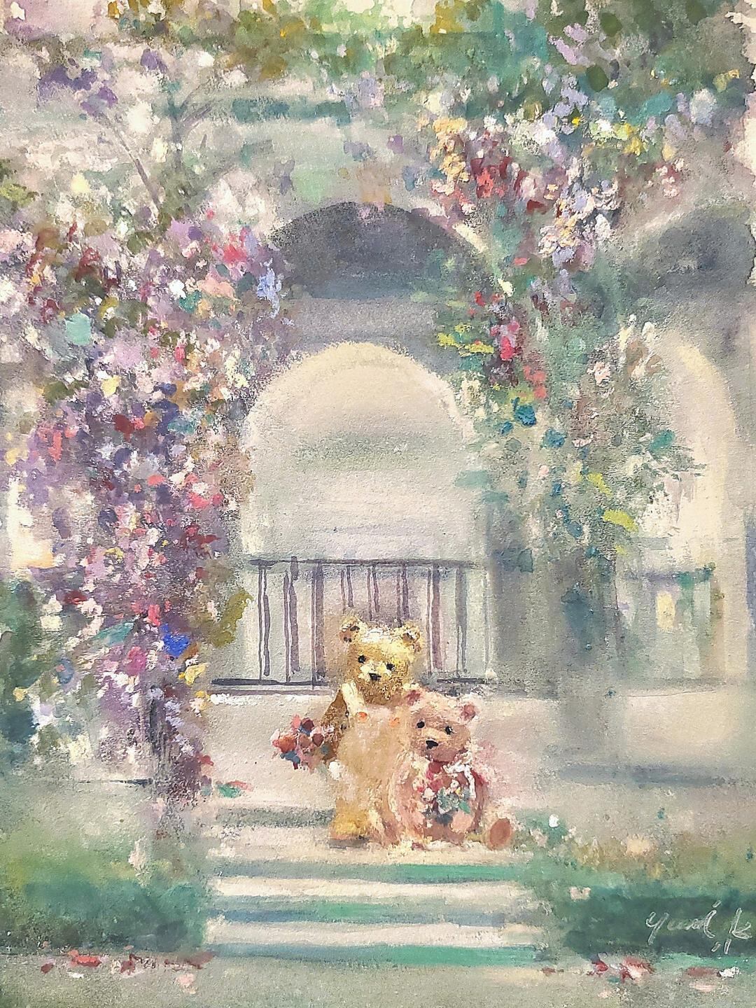 透明水彩と作者がオリジナルで制作しているパステル、JESUSPASTEL(ジーザスパステル)を用いて描かれた作品原画です。藤の花の満開なパリのモスクを舞台に、可愛いテディベア達が登場するメルヘンな世界観。原画に合わせた高級感あるアンティークピンクのフレーム付きです。
